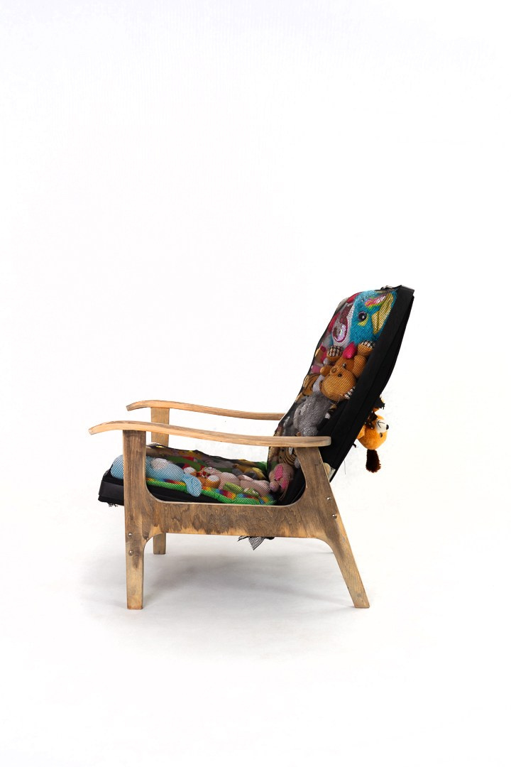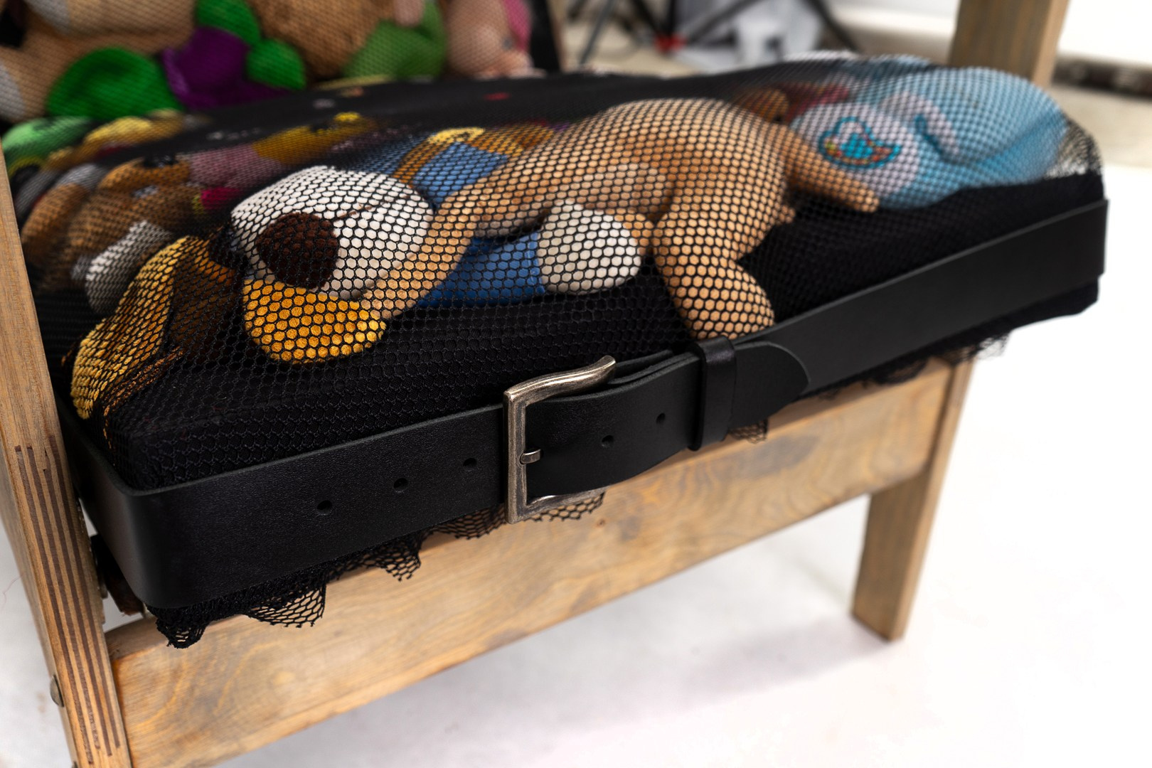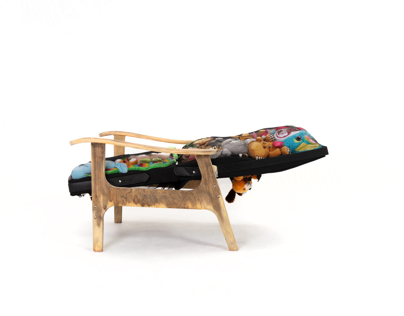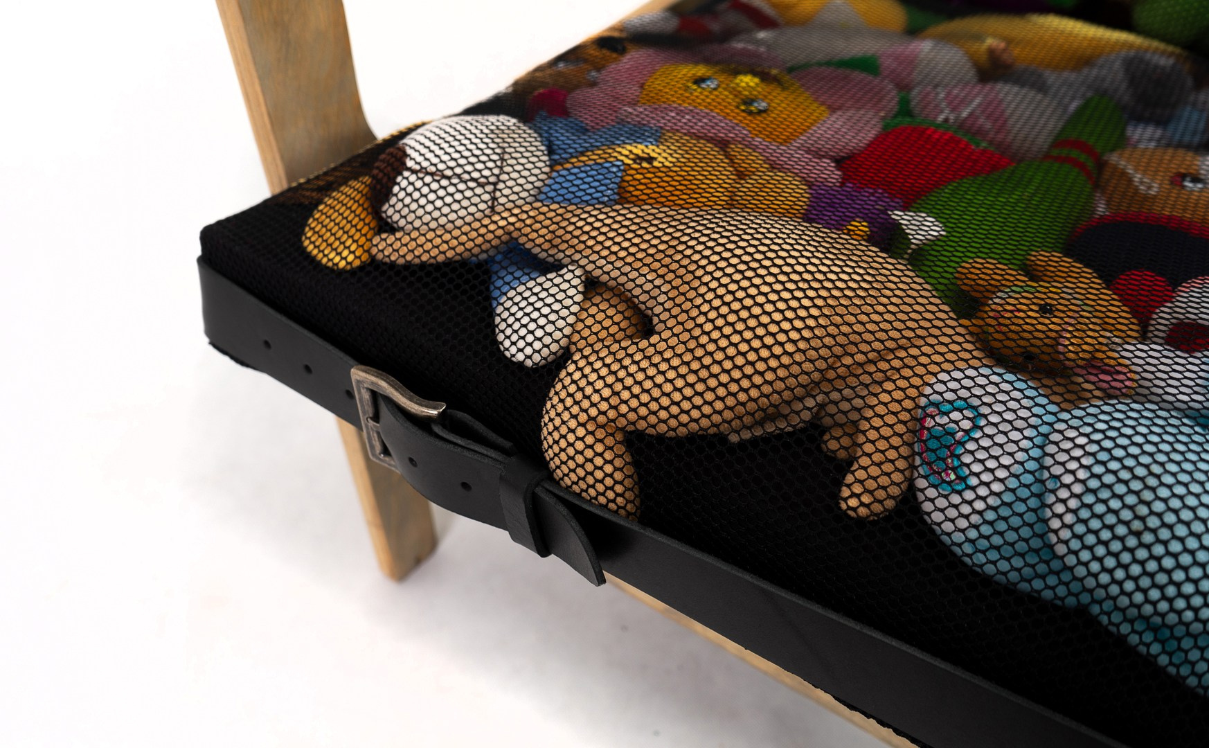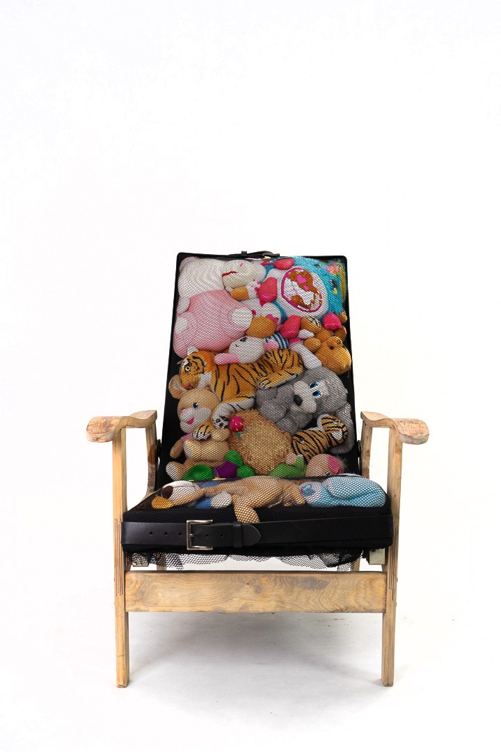 Bright, soft toys — symbols of joy and warmth — are trapped under a dark mesh. Sitting in the chair means pressing them down with one’s own weight, just as we compress and layer our memories into the foundation of the self.