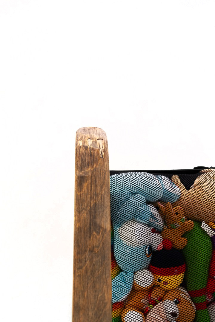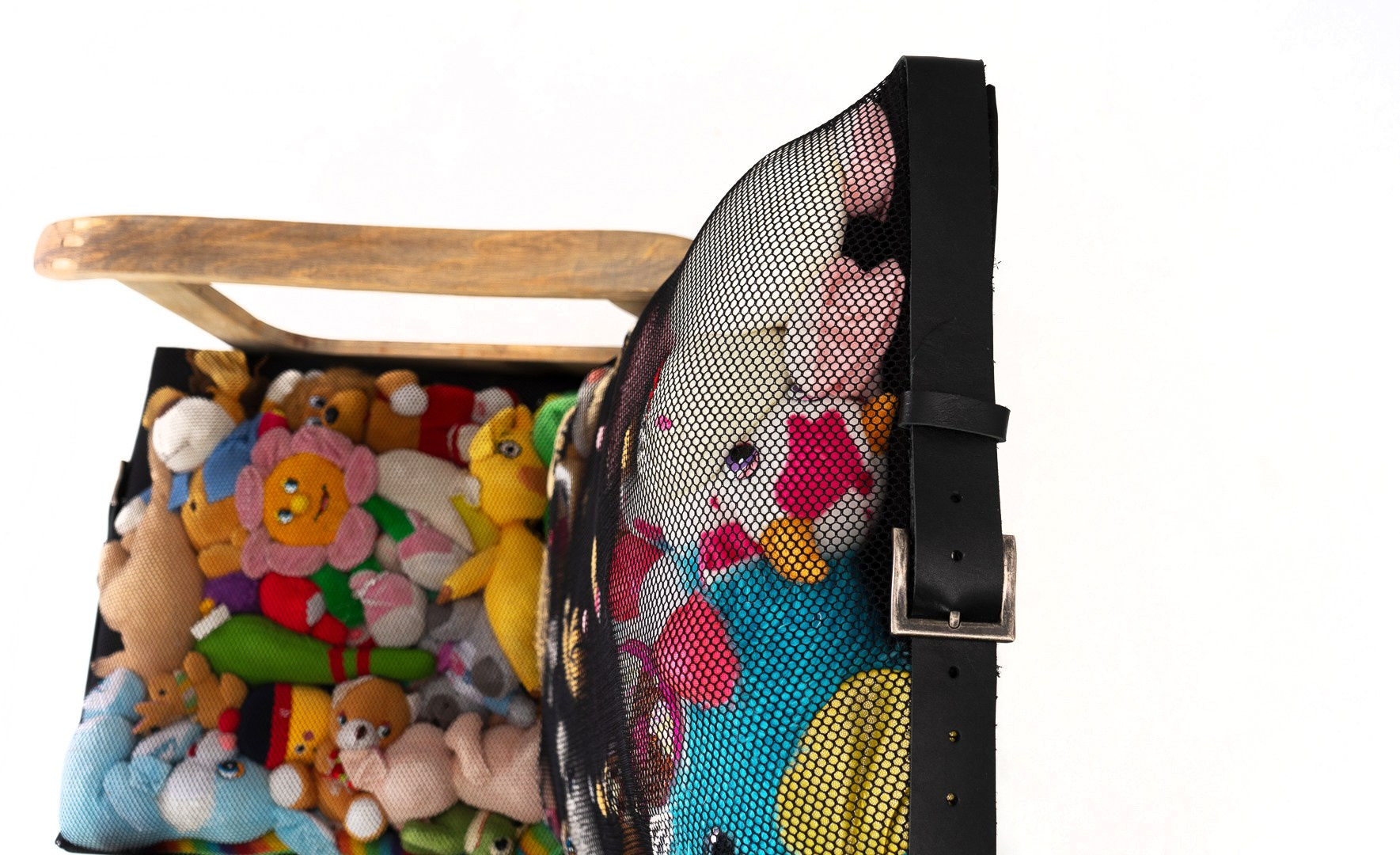A chair filled with toys under a dark mesh turns childhood joy into a metaphor of memory: warmth and softness coexist with tension and weight.